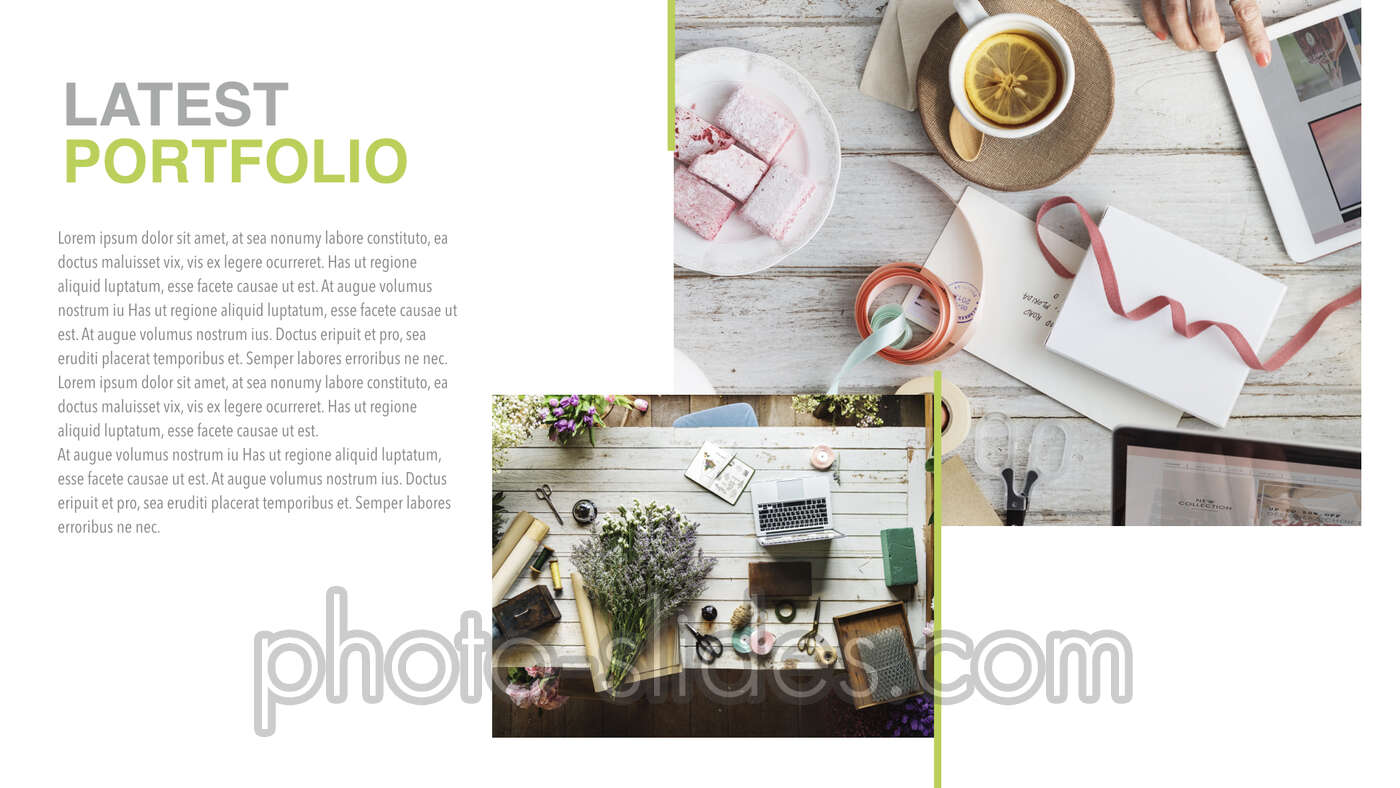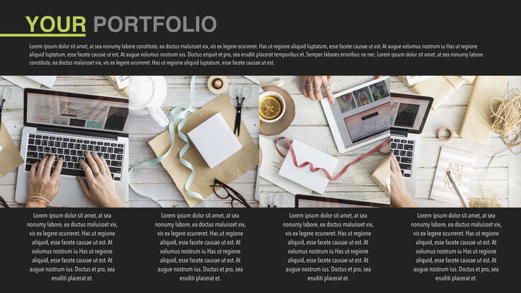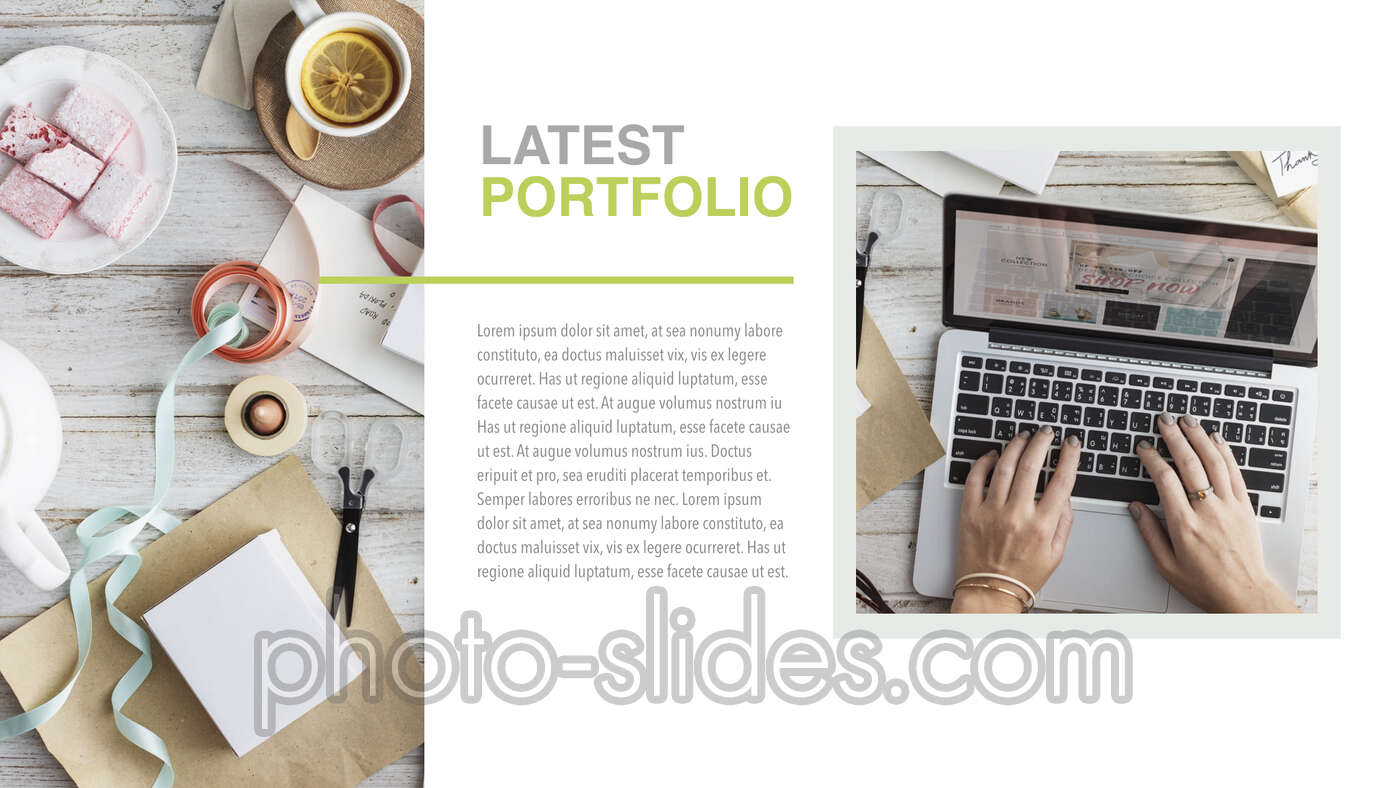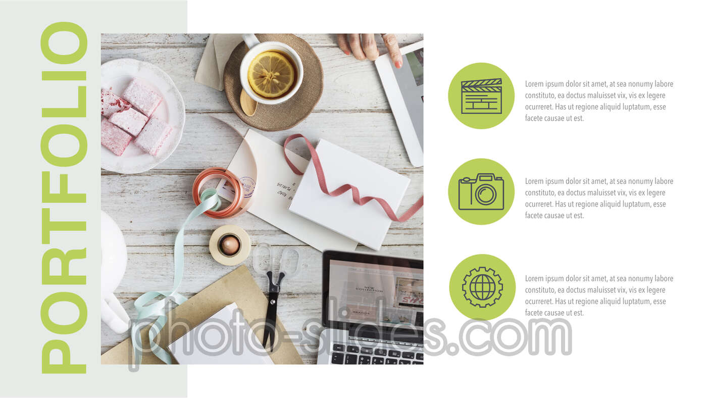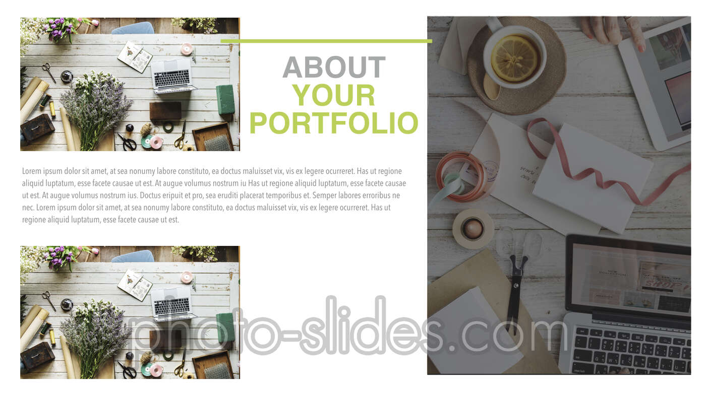 KeyNote Presentation document file "Creative Portfolio" with fully complete slides for your photos, attractive slide and object animations, text and media placeholders designed by professionals. Documentation on using the presentation in different ways: screen viewing, social video sharing, printing cards, books or posters. Links to additional fonts or other resources to download and use them for FREE.