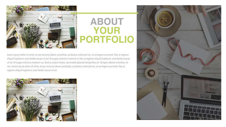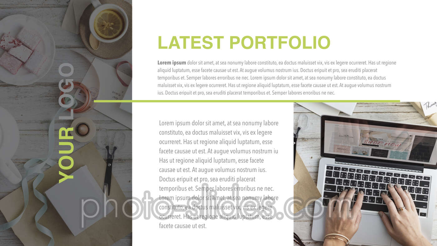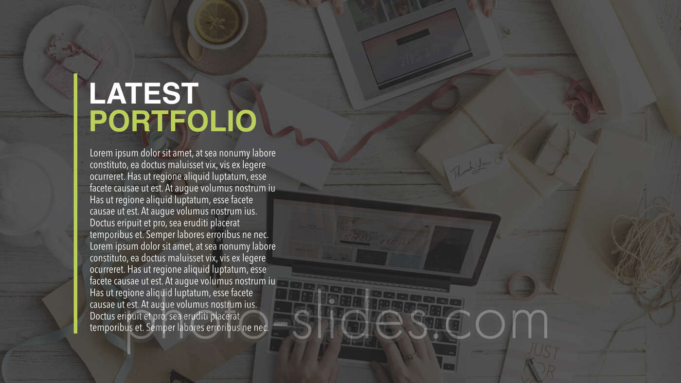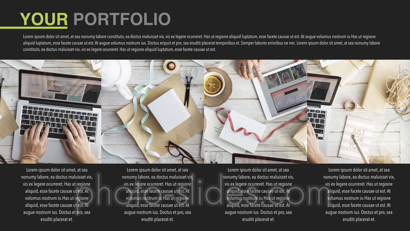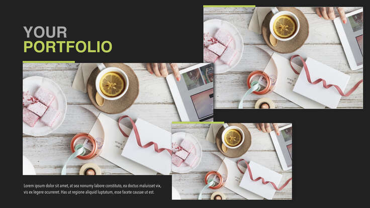 KeyNote Presentation document file "Creative Portfolio" with fully complete slides for your photos, attractive slide and object animations, text and media placeholders designed by professionals. Documentation on using the presentation in different ways: screen viewing, social video sharing, printing cards, books or posters. Links to additional fonts or other resources to download and use them for FREE.
