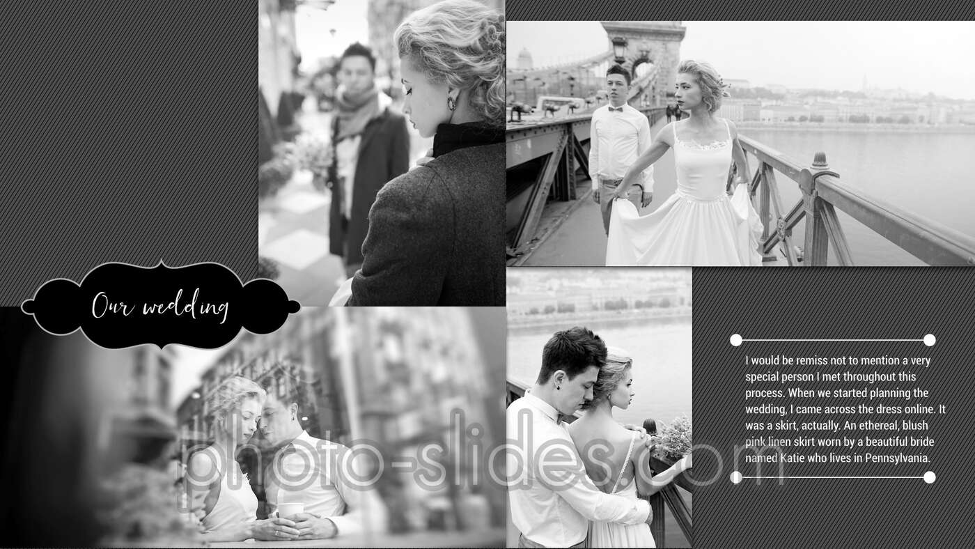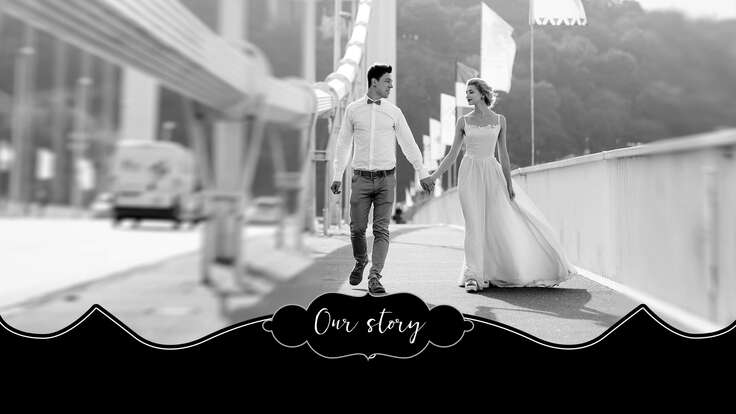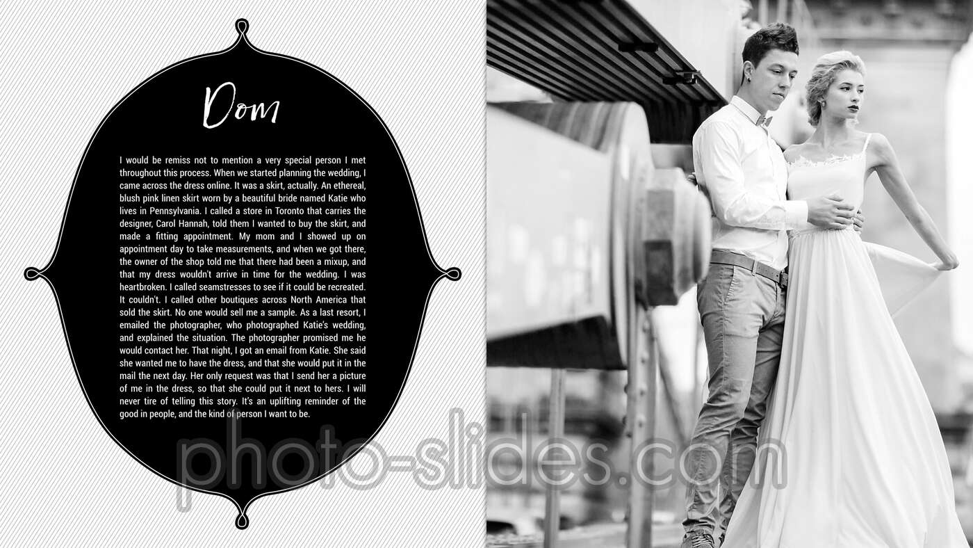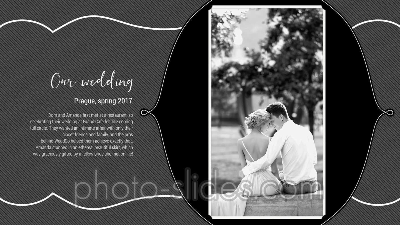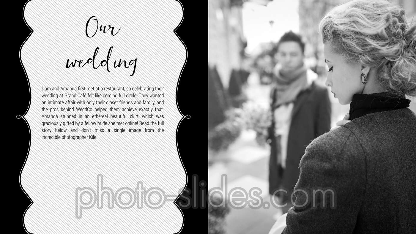 Keynote Presentation document file "Wedding Modern" with fully complete slides for your photos, attractive slide and object animations, text and media placeholders designed by professionals. Documentation on using the presentation in different ways: screen viewing, social video sharing, printing cards, books or posters. Links to additional fonts or other resources to download and use them for FREE.